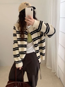 韩系慵懒条纹针织开衫女秋冬宽松显瘦百搭毛衣外套短上衣G1553