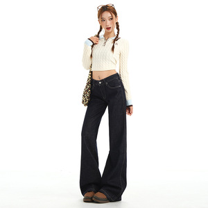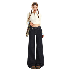 2025年秋冬新款低腰丹宁蓝阔腿喇叭裤显瘦辣妹美式长裤牛仔布图案
