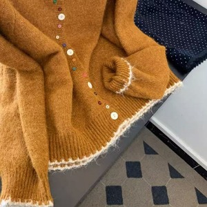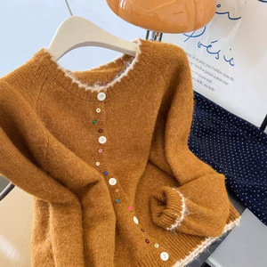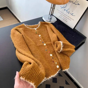 彩扣撞色拼接圆领长袖针织开衫毛衣外套女士2025新款外穿软糯上衣