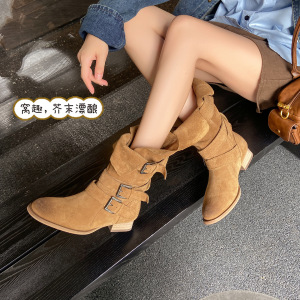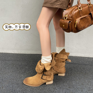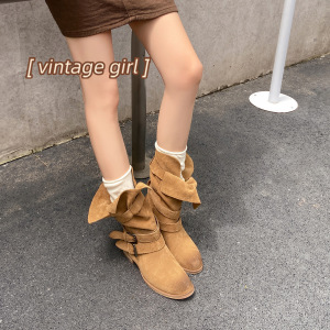 zijin家~那么漂亮!英伦风靴子女中筒靴西部牛仔骑士靴复古堆堆靴