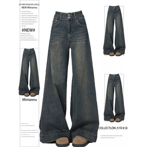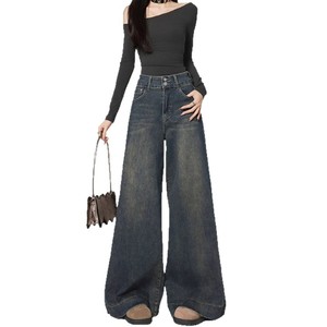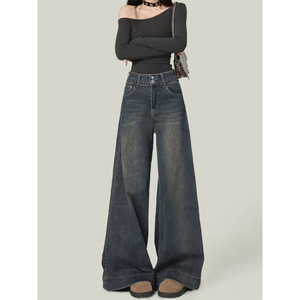 大码女装胖mm复古做旧直筒牛仔裤女新款裤子高腰显瘦设计感阔腿裤