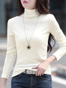 棉质半高领长袖t恤女秋冬季新款纯色螺纹修身打底衫中领内搭上衣