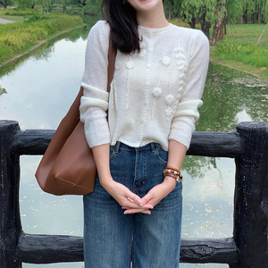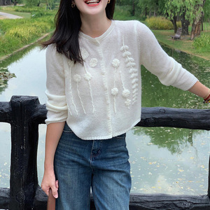 初秋氛围感穿搭白色提花毛衣开衫外套女外搭早秋韩系短款针织上衣