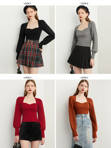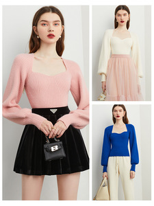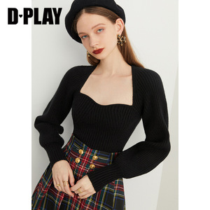 DPLAY2025秋季法式方领毛衣红色针织衫灯笼袖毛衣厚款上衣女