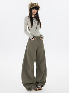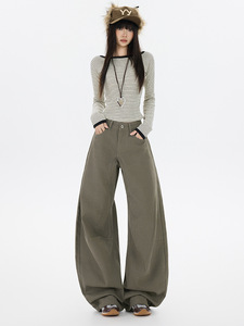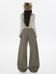 咖绿色弯刀牛仔裤女新款2025高腰显瘦宽松直筒美式复古拖地休闲裤