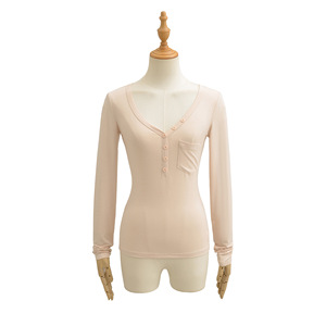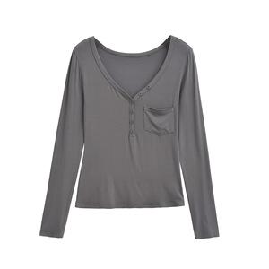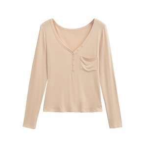 甜辣扭扣白色v领打底上衣女秋季百搭垂坠感薄款修身长袖套头T恤批