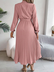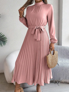 2025欧美秋冬优雅立领长袖收腰百褶长裙小礼服 亚马逊跨境女装