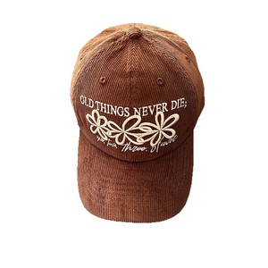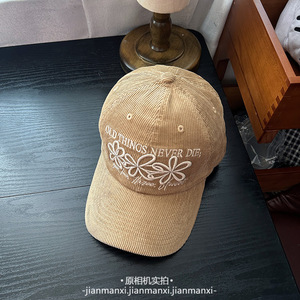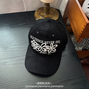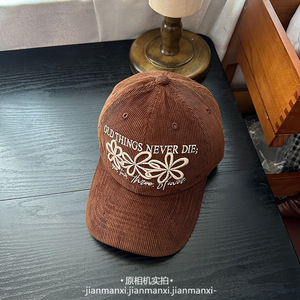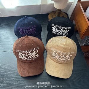 复古撞色三朵花刺绣灯芯绒棒球帽子女秋冬新款百搭休闲遮阳鸭舌帽