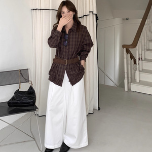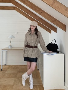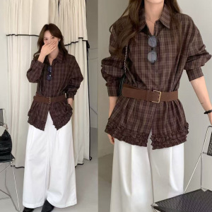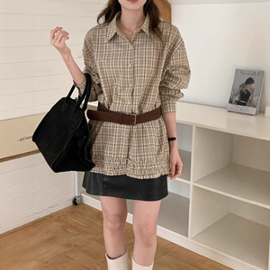 实拍早秋新款韩版新款翻领单排扣宽松格子边长袖衬衫上衣 配腰带