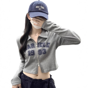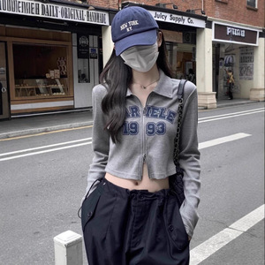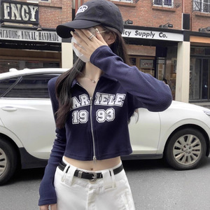 美式复古辣妹设计感双拉链短款上衣女早秋修身潮牌印花T恤打底衫