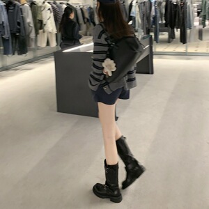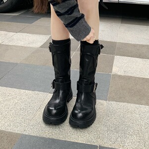水洗牛皮版~葡萄ma同款英黎街头真皮酷飒圆头扣带厚底骑士靴女