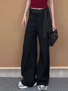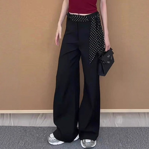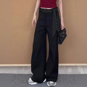 时髦气质黑色波点腰带复合乱麻喇叭裤2025新品高腰显瘦百搭休闲裤