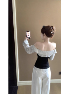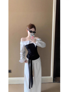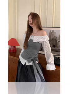 2025秋季新款女感收腰绑带一字领长袖上衣法式气质显瘦设计感衬衫