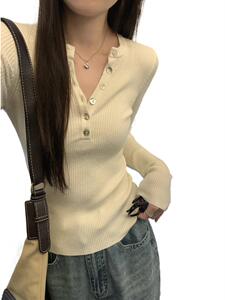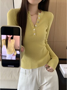 设计感韩系V领纽扣针织衫女春秋季长袖修身打底衫感内搭上衣