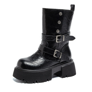 内增高黑色两穿厚底短靴女秋季新款美拉德皮带扣中筒靴翻折马丁靴