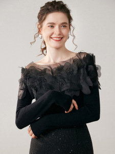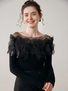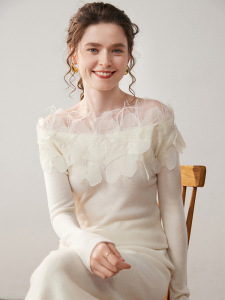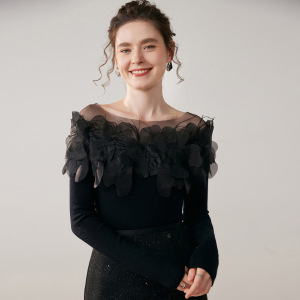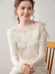 工厂批发法式立体花朵一字肩纯色山羊绒衫女长袖别致内搭毛衣女