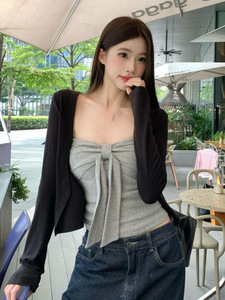 韩系高级感黑色长袖外套女早秋季2025新款开衫配抹胸吊带上衣套装
