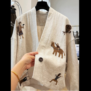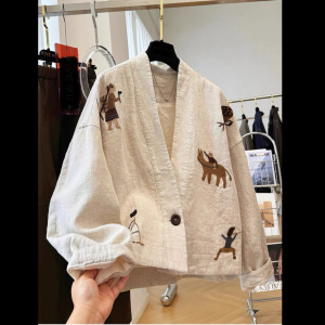 2025秋款上新感重工刺绣独特别致V领文艺复古棉麻短款外套女