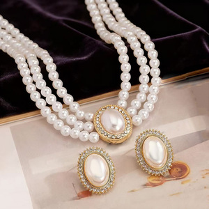 欧美热销复古椭圆超闪珍珠新娘项链女法式风礼服婚纱耳钉项链套装