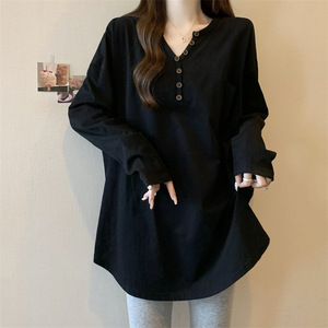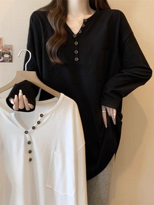 v领打底衫女春秋内搭中长款白色长袖t恤宽松显瘦洋气配鲨鱼裤上衣