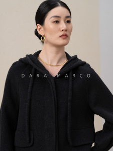 冬日高JI感双面山羊绒桑蚕丝黑灰色针织连帽短款轻柔立绒大衣外套