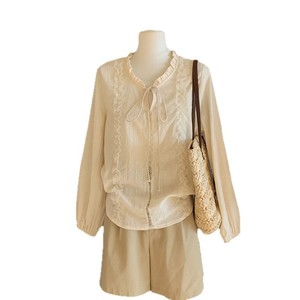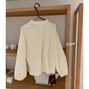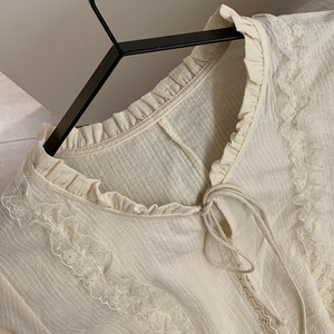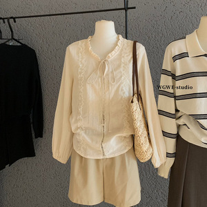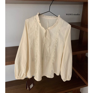 WGWE7289法式系带花边设计感温柔宽松长袖小衫新款简约高级感上衣