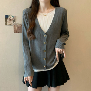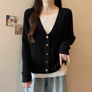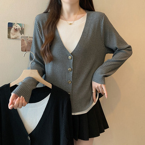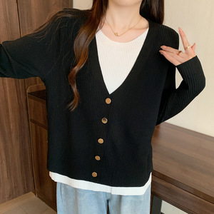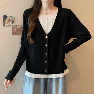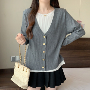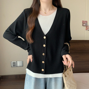实拍2025秋大码胖mm撞色拼接假两件针织衫宽松显瘦遮肉毛衣69169