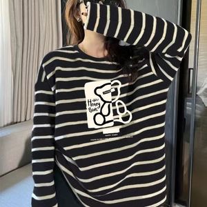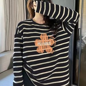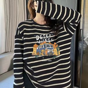 条纹设计感纯棉圆领长袖t恤女韩版宽松时尚百搭减龄上衣春秋季潮