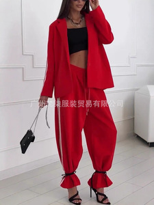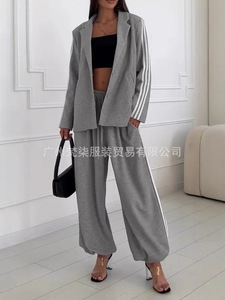 亚马逊2025欧美跨境翻领条纹夹克休闲西服外套阔腿长裤休闲套装女