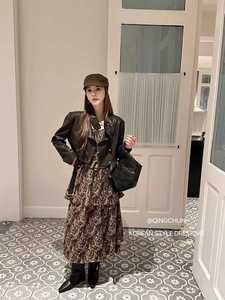 法式复古轻熟风甜酷短款皮衣外套+腰果花吊带裙+腰带洋气两件套女