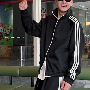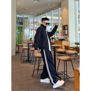 秋季新款美式撞色三条杠运动男卫衣休闲立领外套裤子潮流时尚套装