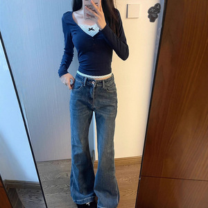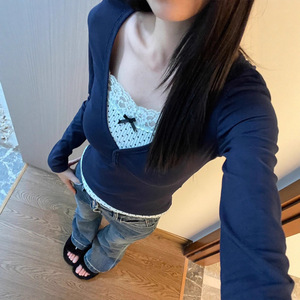 美式甜辣复古修身假两件打底衫上衣女秋冬V领纯欲紧身显瘦长袖T恤