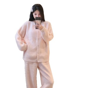 半边绒睡衣纯色珍珠扣圆领针织开衫外套秋冬新款气质小香风家居服