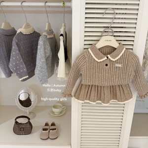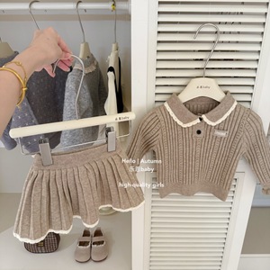 【乐恩童装】原创设计秋冬女童卡其色学院风针织毛衣百褶裙两件套