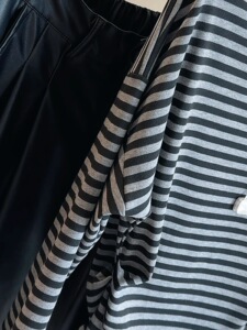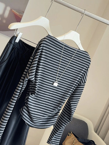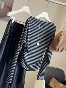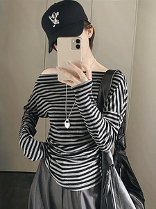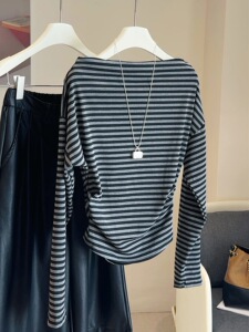 条纹一字领斜肩褶皱收腰修身显瘦长袖上衣T恤女韩版2025秋季新款