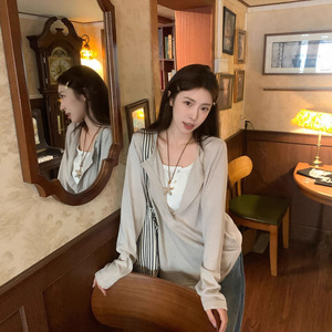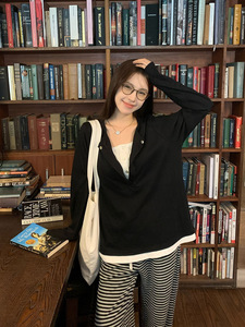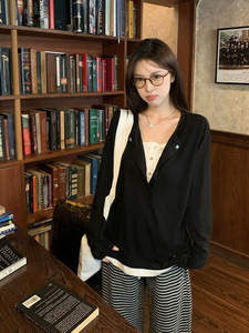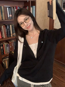慵懒风半开领黑色假两件设计宽松长袖T恤女秋季2025新款休闲上衣