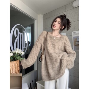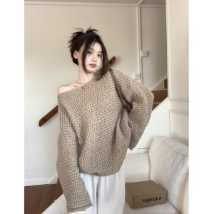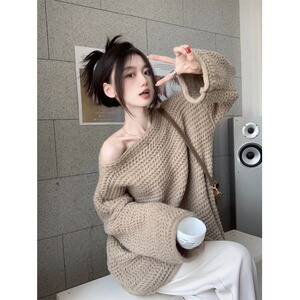早秋冬慵懒风宽松显瘦针织长袖上衣温柔斜肩毛衣小众别致露肩上衣