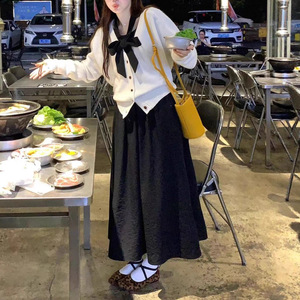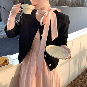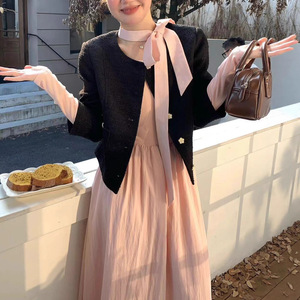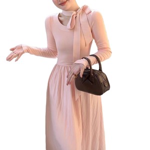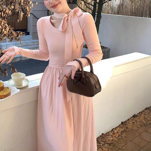 火火火奶霜桃桃韩版挂脖针织长袖连衣裙女温柔风收腰秋季长裙粉色