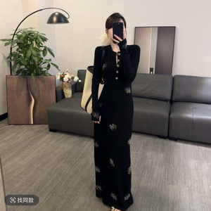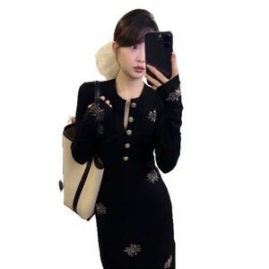 OS&oneshow秋季新款亮闪闪烫钻高级感V领长袖黑色连衣裙设计感
