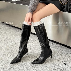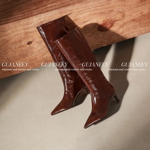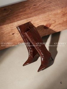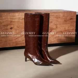 欧洲站女鞋25秋冬时尚软褶皱油蜡牛皮尖头舒适款套筒小猫低跟长靴