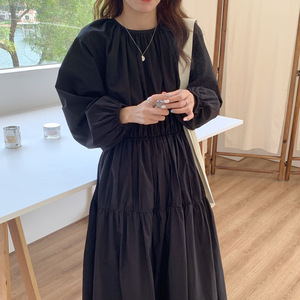 实拍实价 复古赫本风 褶皱设计 层层蛋糕裙 收腰长袖连衣裙 3色