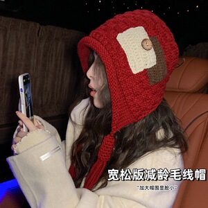 2025新款时尚贴布流苏红色毛线帽子女秋冬季保暖手工辫子针织帽潮