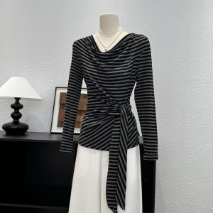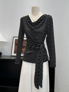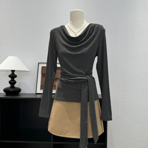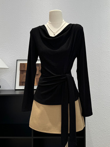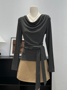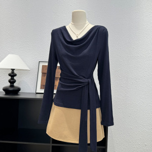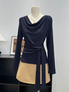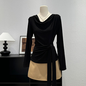 设计感小众荡领系带长袖t恤女早秋季洋气百搭打底衫别致绝美上衣