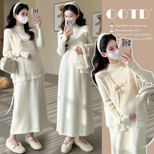 孕妇装2025秋冬季新款韩版时尚重工钩花马甲+软糯打底裙孕妇套装