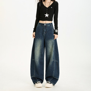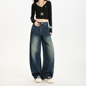 美式复古休闲弯刀牛仔裤女2025秋冬设计高腰宽松显瘦拖地阔腿裤子