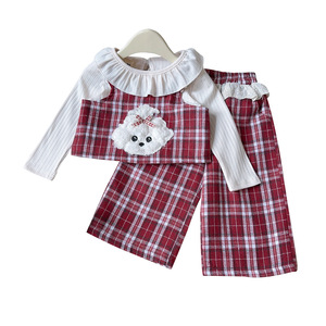 女童套装春秋新款2025长袖打底衫卡通小狗背心格子长裤休闲三件套