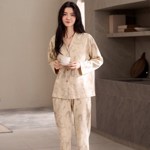 实体批发现货发 棉质V领睡衣女长袖长裤秋季新款休闲家居服可外穿