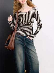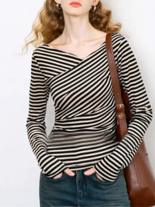 JWUNIQE酒窝 设计感条纹长袖斜肩T恤女2025年早秋新款不规则上衣