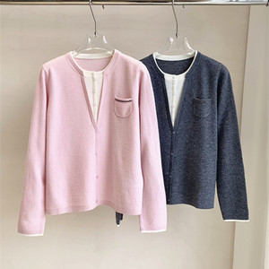 撞色羊毛衫假两件针织衫女开衫设计感小众圆领长袖毛衣外穿25新款