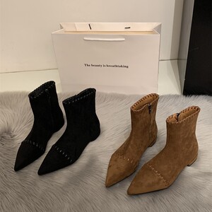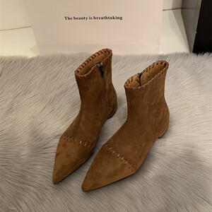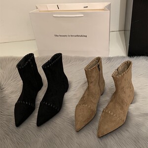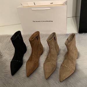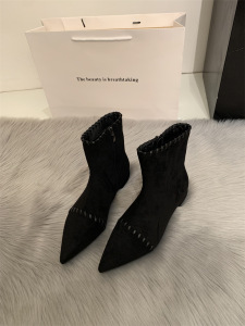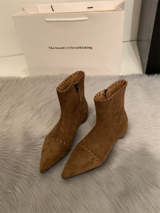 韩系尖头小猫跟瘦瘦靴女2025秋冬时尚低跟小裸靴气质百搭绒面短靴